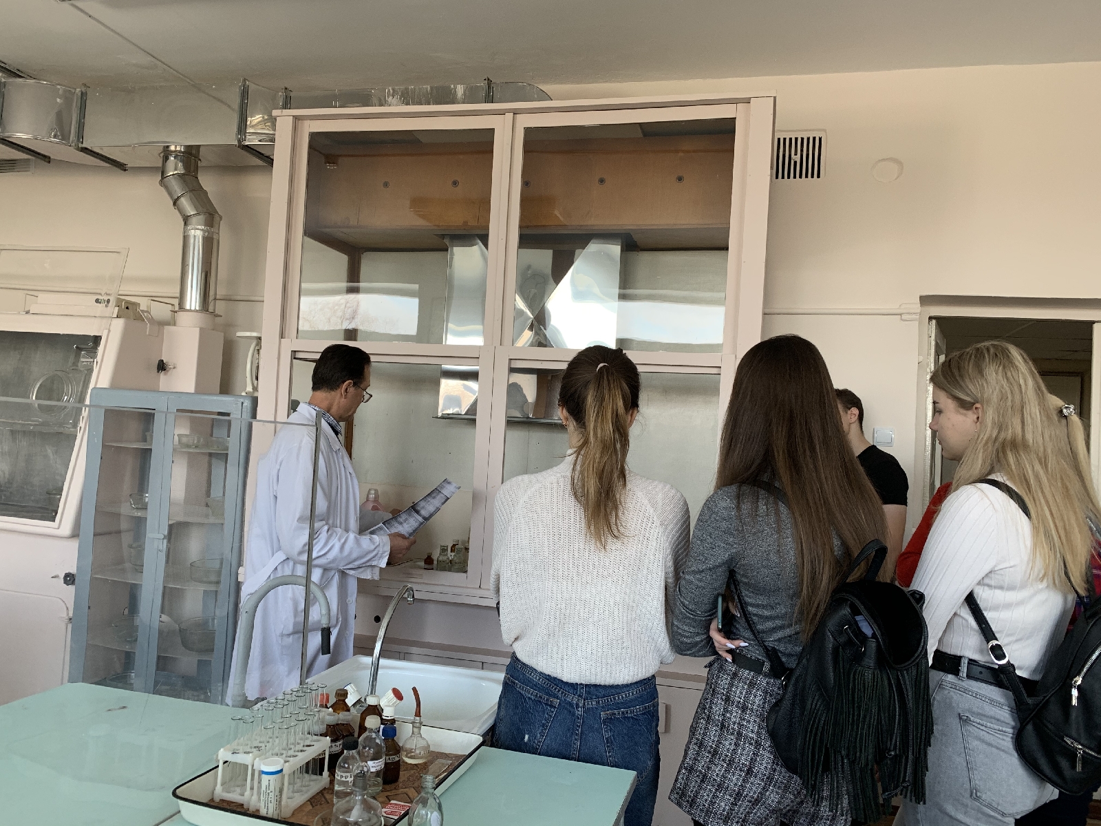В начале мероприятия студент-практикант, учитель биологии МБОУ СОШ 77 школы Кабанова М. С. на примере 476 аудитории ФФМЕН познакомила учащихся с работой и оборудованием лаборатории прикладной химии. Доцент кафедры к. х. н. Зимняков А. М. продемонстрировал в лаборатории органического синтеза демонстрационные качественные реакции на органические и неорганические вещества. В ходе встречи также уделялось внимание вопросам подготовки учащихся к сдаче ЕГЭ по химии на тему «Химические производства».