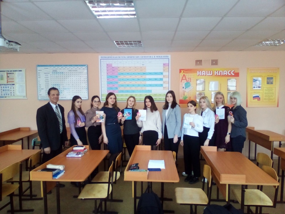 В заключении Зимняков А.М. поздравил учениц с Международным женским Днем 8 марта, отметив при этом, что классный руководитель 10в класса Каюмова М. Б., является успешным выпускником направления подготовки «Химия», профиля «Аналитическая химия» педагогического института им. В.Г. Белинского, ПГУ.