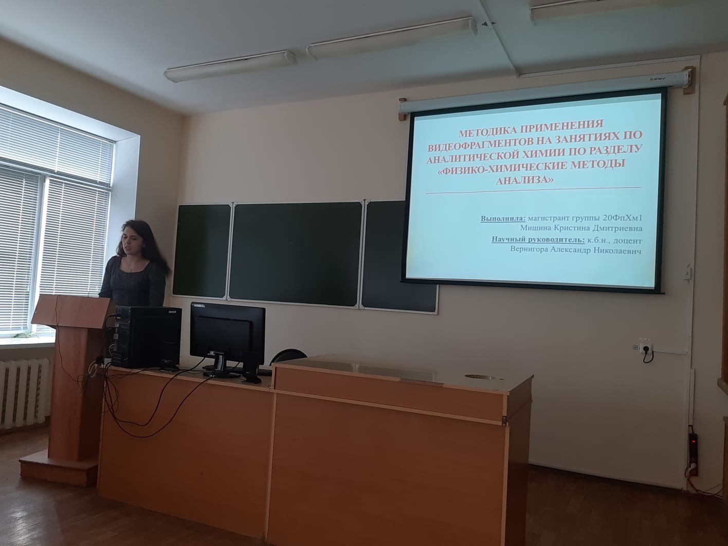 1 место – Мишина Кристина Дмитриевна, студентка гр. 20ФпХм1, доклад на тему: «Методика применения видеофрагментов на занятиях по аналитической химии по разделу «Физико-химические методы анализа», научный руководитель: Вернигора А.Н., доцент кафедры ХиТиМОХ.
