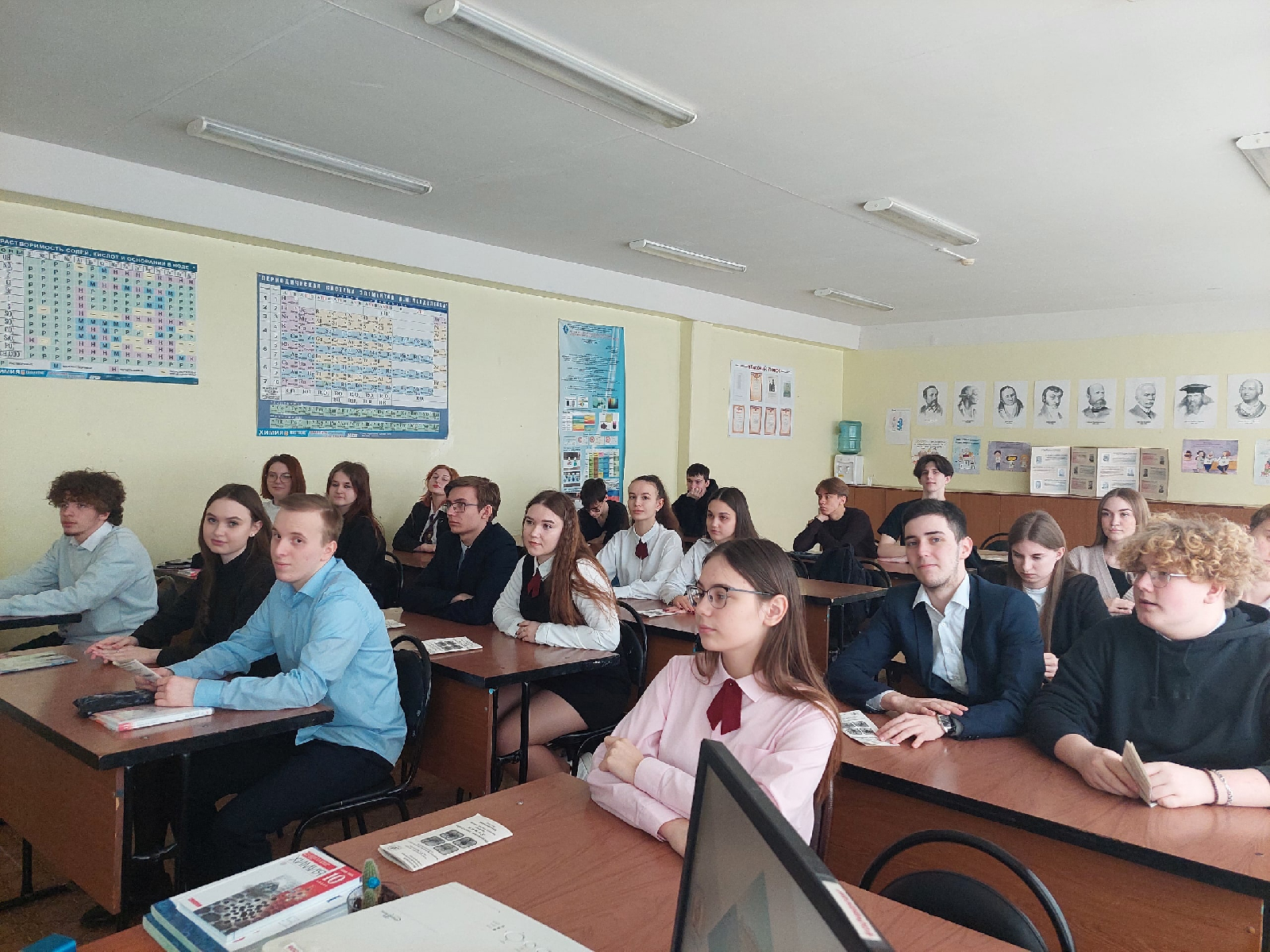 11 марта 2023 года ассистент кафедры "Химия и методика обучения химии" Хусаинова А. А. провела встречу со старшеклассниками МБОУ СОШ N 11 г. Пензы. Она рассказала школьникам о перспективах получения профессии химика-аналитика, правилах приёма абитуриентов в 2023 году.