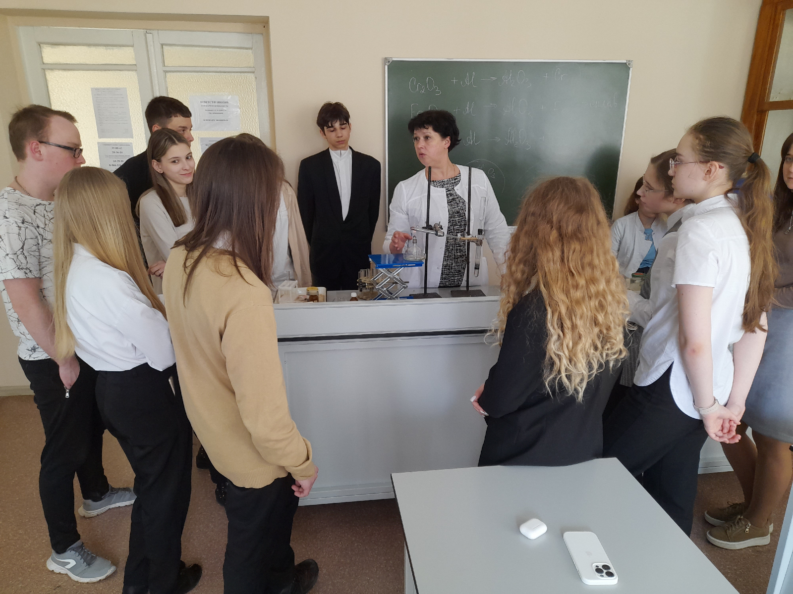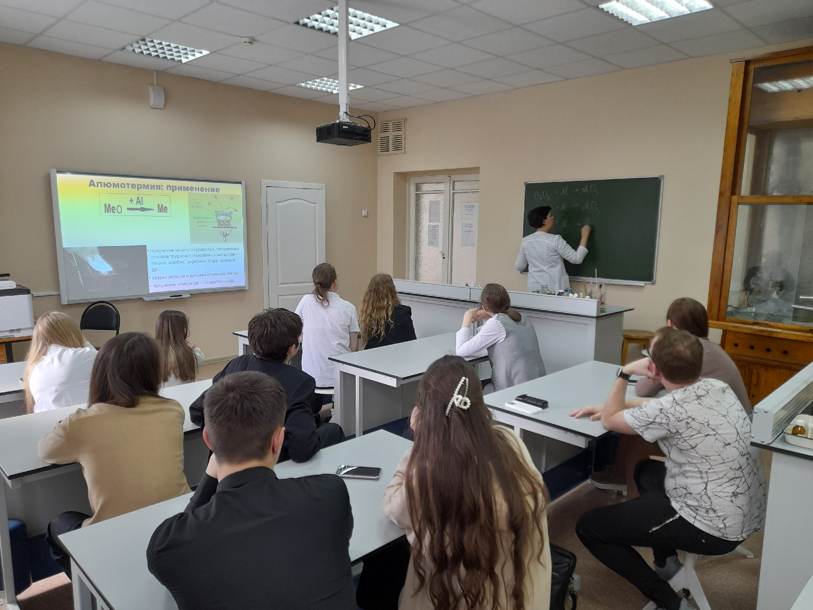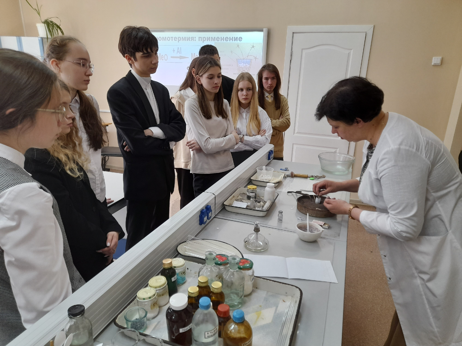 Н.В. Фирстовой, лаборантом кафедры Сергеем Тюриным и магистрантами 2 года обучения Мариной Лылиной и Софьей Гришиной вызвал интерес у обучающихся. В ходе проведения мастер-класса, обучающиеся познакомились с теоретическими основами металлургии, а также с их практическим воплощением в эксперименте, - водородо- и алюмотермией.