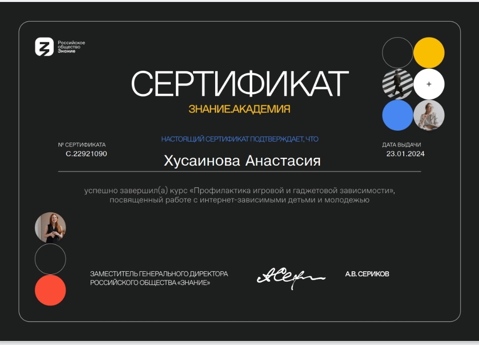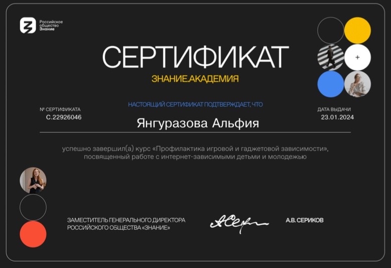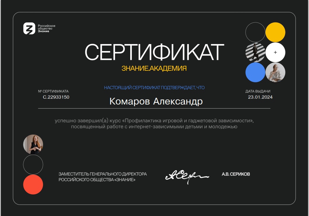 В рамках проекта "Знание.Академия" и распоряжения Правительства РФ, сотрудники кафедры ХиМОХ, доцент Комаров А.А., старший преподаватель Янгуразова А.З., ассистент Хусаинова А.А. прошли онлайн-курс по профилактике негативных социальных явлений в детской и молодежной среде.