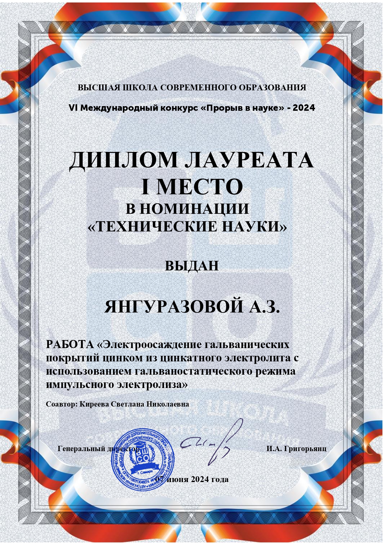 27 июня 2024 года на Ученом совете Пензенского государственного университета старший преподаватель кафедры «Химия и методика обучения химии» Янгуразова Альфия Зякярьяевна была награждена дипломом лауреата I степени в номинации «Технические науки» за победу в VI Международном конкурсе научных статей «Прорыв в науке» - 2024. Она принимала участие с работой на тему: «Электроосаждение гальванических покрытий цинком из цинкатного электролита с использованием гальваностатического режима импульсного электролиза» в соавторстве с научным руководителем деканом ФПТЭТ, д.т.н, профессором Киреевым С.Ю. и доцентом кафедры "Химия" Киреевой С.Н.