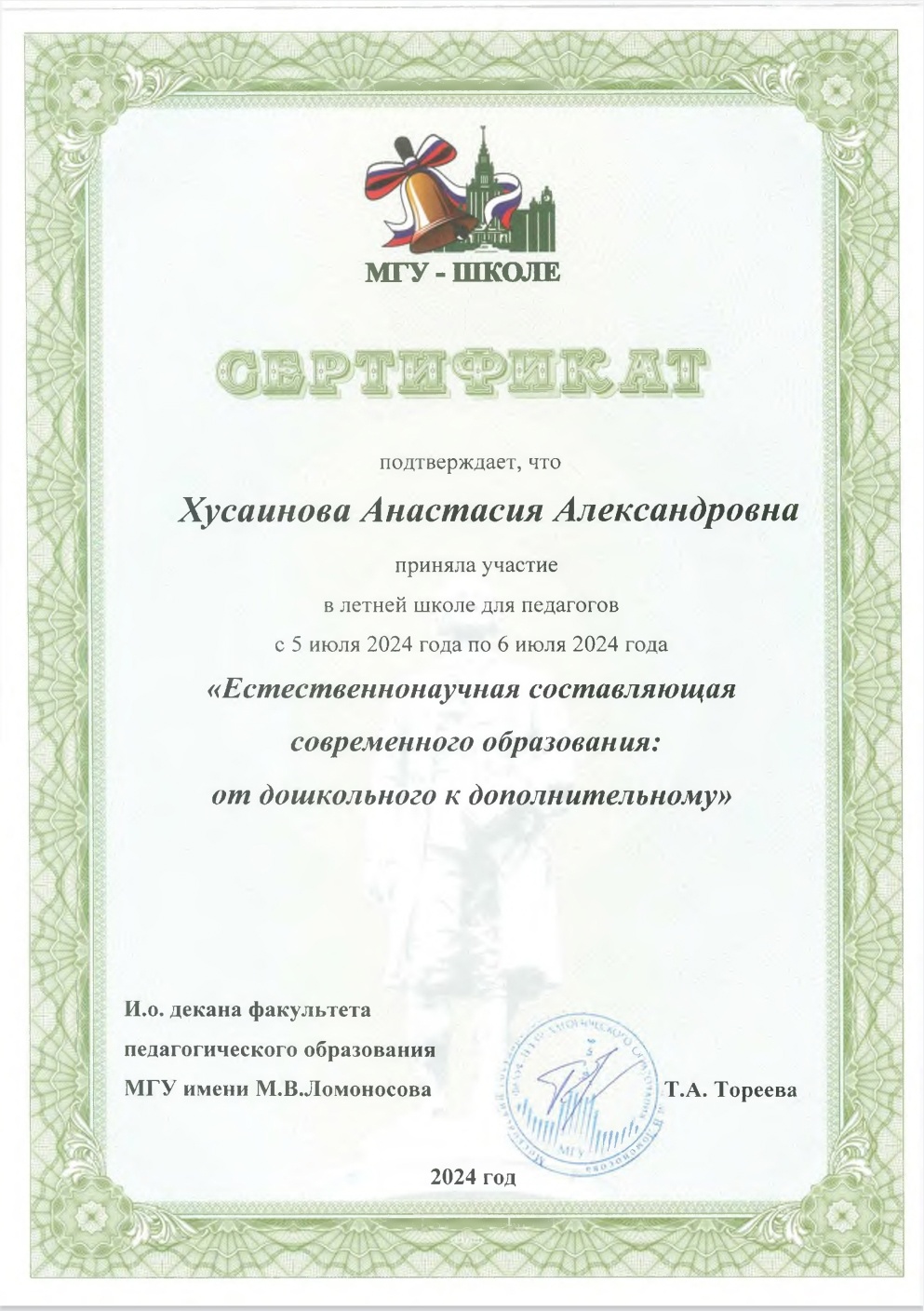 5 и 6 июня 2024 года старший преподаватель кафедры ХиМОХ Хусаинова А.А. принимала участие в работе летней школы для специалистов с высшим образованием, педагогов, воспитателей, психологов и преподавателей средней и высшей школы на базе Московского государственного университета имени М.В. Ломоносова.