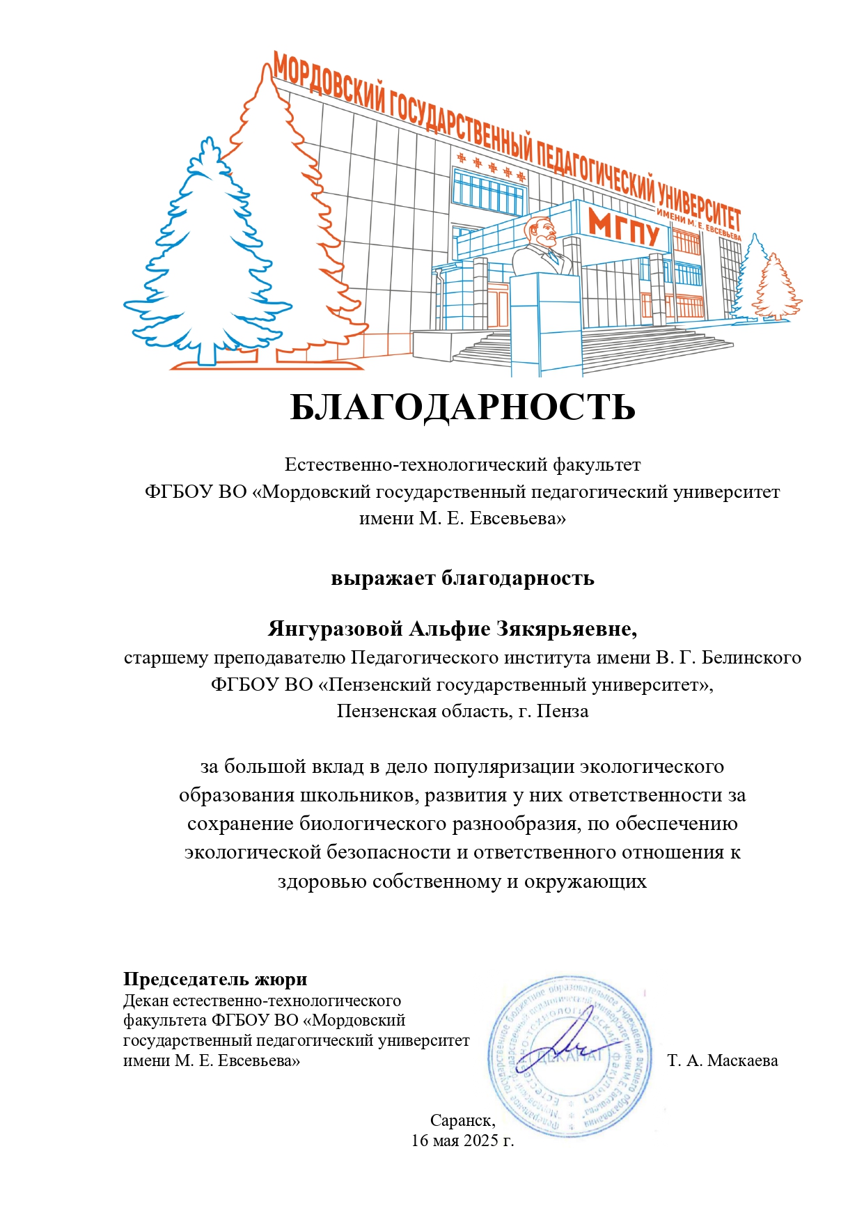 16 мая 2025 года студентка группы 23ФХ1 Понарядова Варвара и ее научный руководитель – старший преподаватель кафедры «Химия и методика обучения химии» Янгуразова А.З. приняли участие в III Всероссийском конкурсе студенческих и ученических исследовательских и проектных работ «Экология вокруг нас», г. Саранск. Их работа на тему «Определение ионов тяжелых металлов методом ИВА и жесткости методом комплексонометрического титрования в пробах природной подземной воды г. Сыктывкар» была высоко оценена жюри, и авторы удостоены диплома II степени.